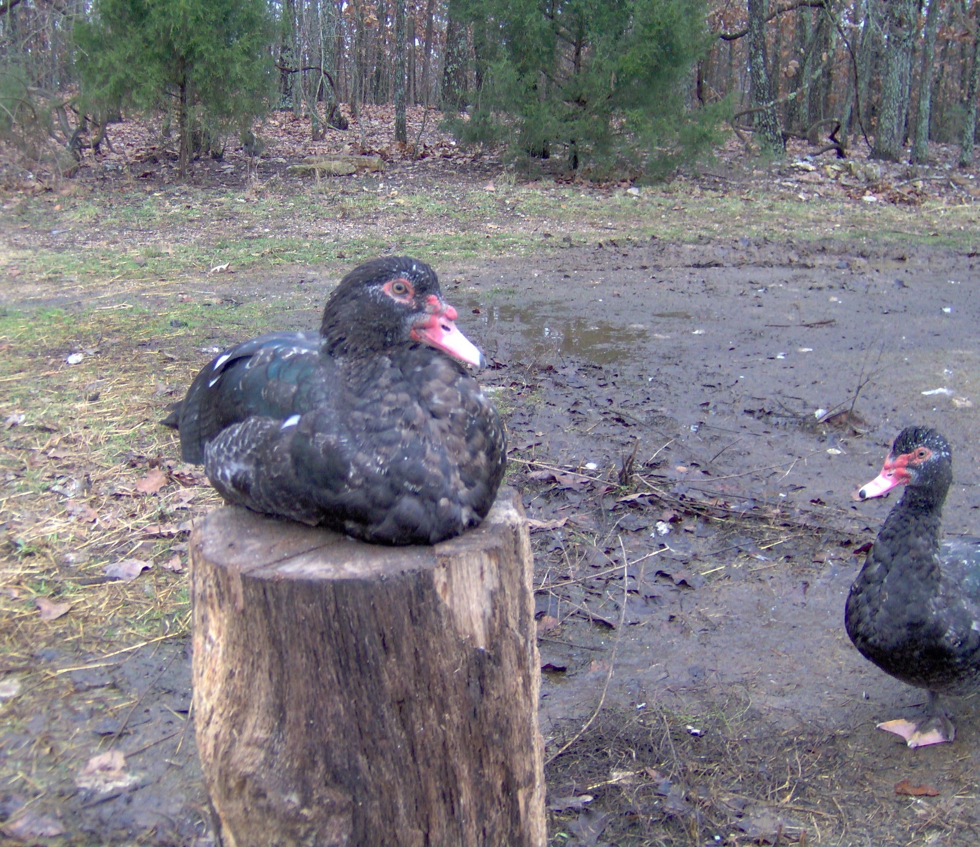 Muscovys are the only domestic ducks that are not derived from Mallard stock. They are a South American species. Males are huge, weighing up to twelve pounds, with the females grow to be about seven Their feet have strong sharp claws and are built to grasp, so that they can perch on branches, this makes them sort of hard to deal with sometimes. Muscovy's will often fly up and roost.