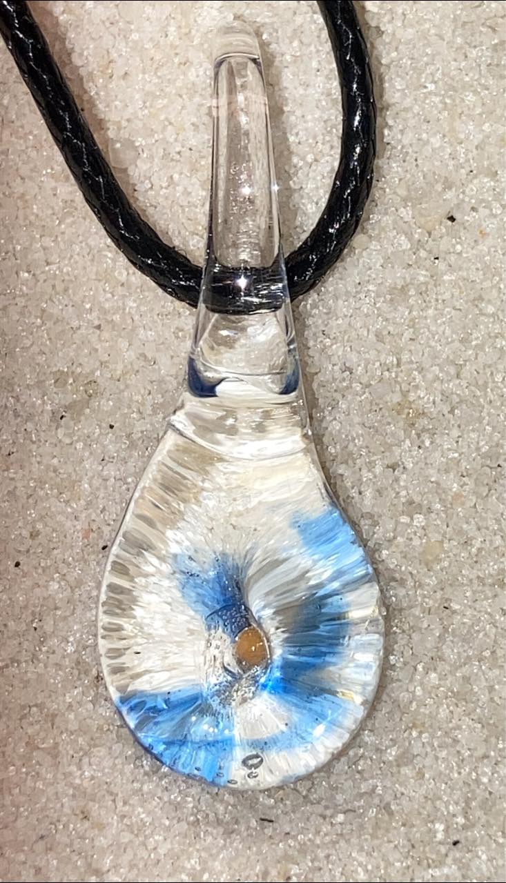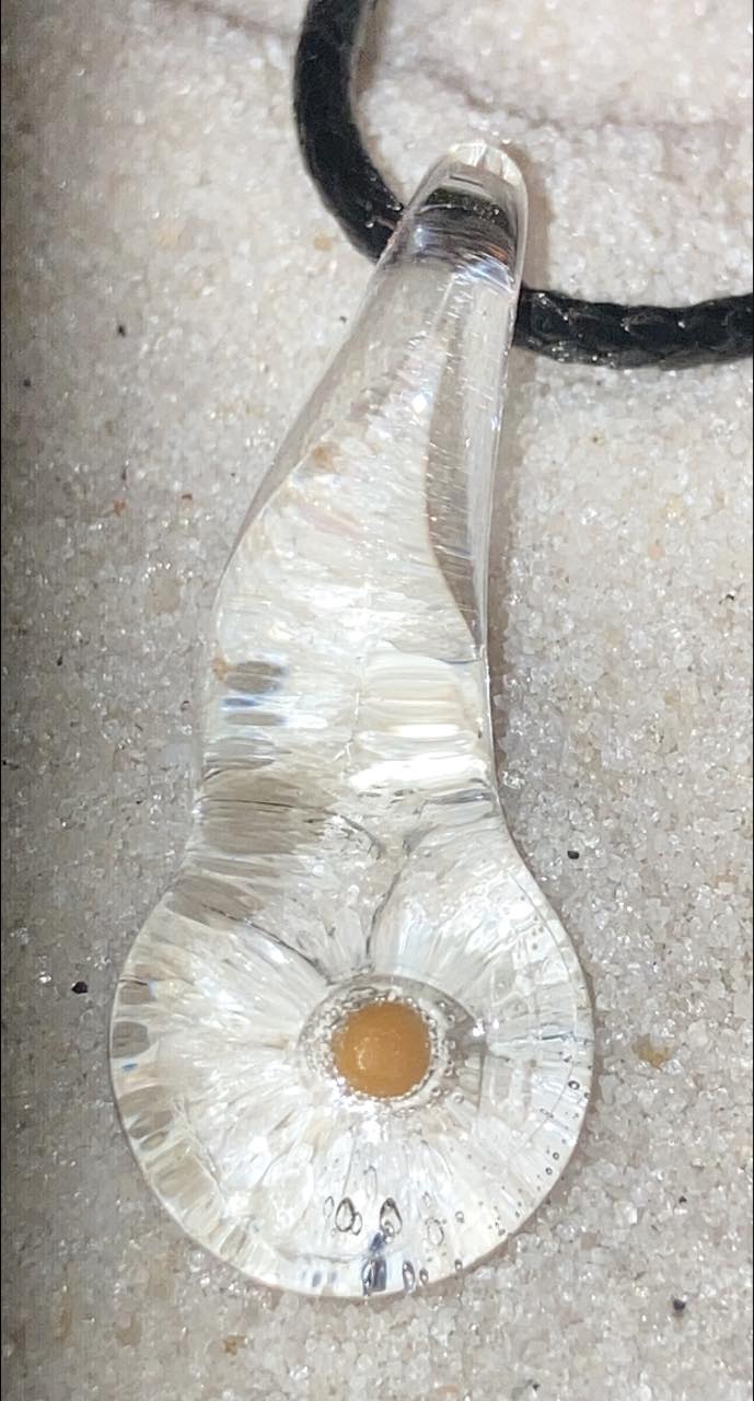 This is a glass pendant formed around a mustard seed. The mustard seed represents growth, dependence and faith and was created with great love by me, as it was by my teacher, and her teacher before her. The energy of the Great Ozark Mountains and the flames of my fires produced this powerful amulet.